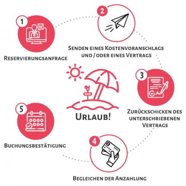 Nach Erhalt Ihrer Kostenvoranschlags- und/oder Reservierungsanfrage, senden wir Ihnen Ihren Kostenvoranschlag mit oder ohne Reservierungsvertrag, je nach Anfrage.