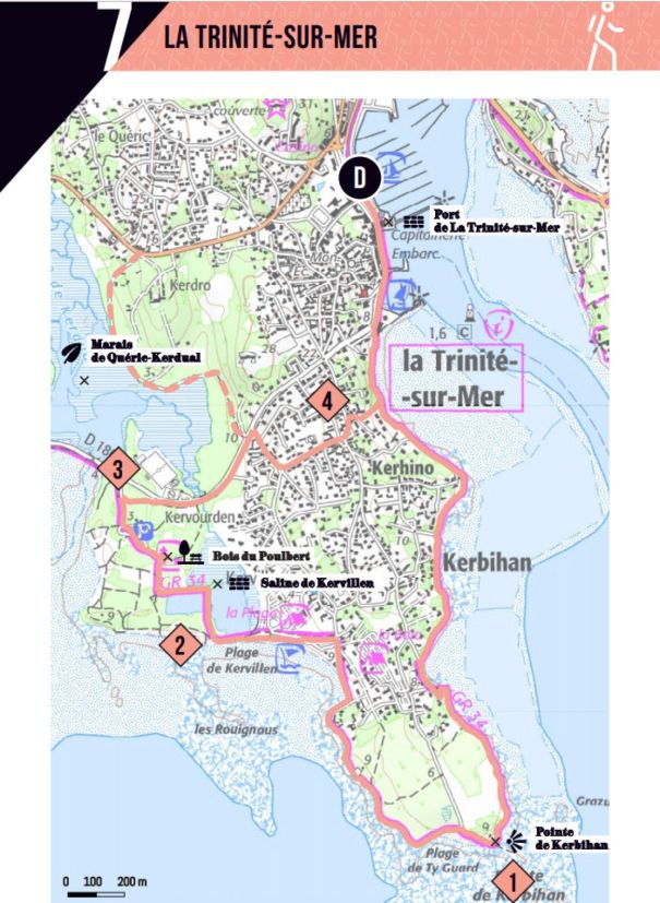 Die Wanderstrecke fängt offiziell am Gemeindeamt von La Trinité sur Mer an, aber Sie können den Spaziergang am Strand vom Campingplatz aus beginnen. Das Wanderdokument kann unten auf der Seite heruntergeladen werden.